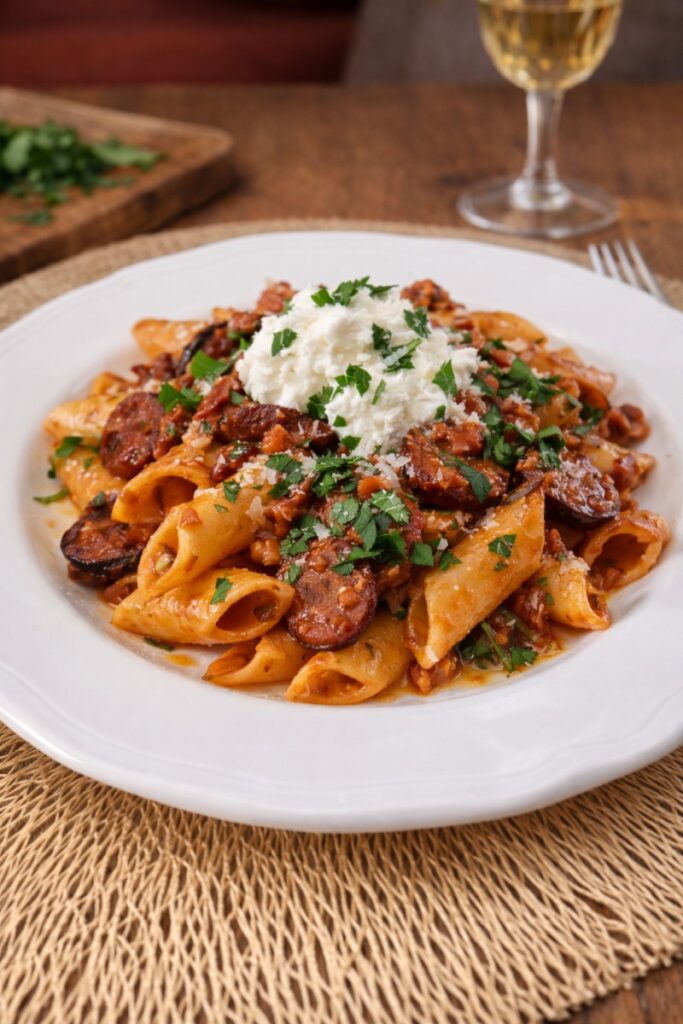 Wyrazisty, aromatyczny i pełen charakteru, a jednocześnie szybki do zrobienia – ten makaron to połączenie intensywności i kremowej przyjemności. Pikantne chorizo nadaje daniu głębi i lekko dymnego akcentu, który doskonale łączy się ze słodyczą suszonych pomidorów i delikatnością szalotki. Całość spaja aksamitny sos o wyraźnym, pomidorowym profilu. Świeża natka pietruszki, ricotta i parmezan dopełniają kompozycję, nadając jej świeżości i eleganckiego wykończenia.