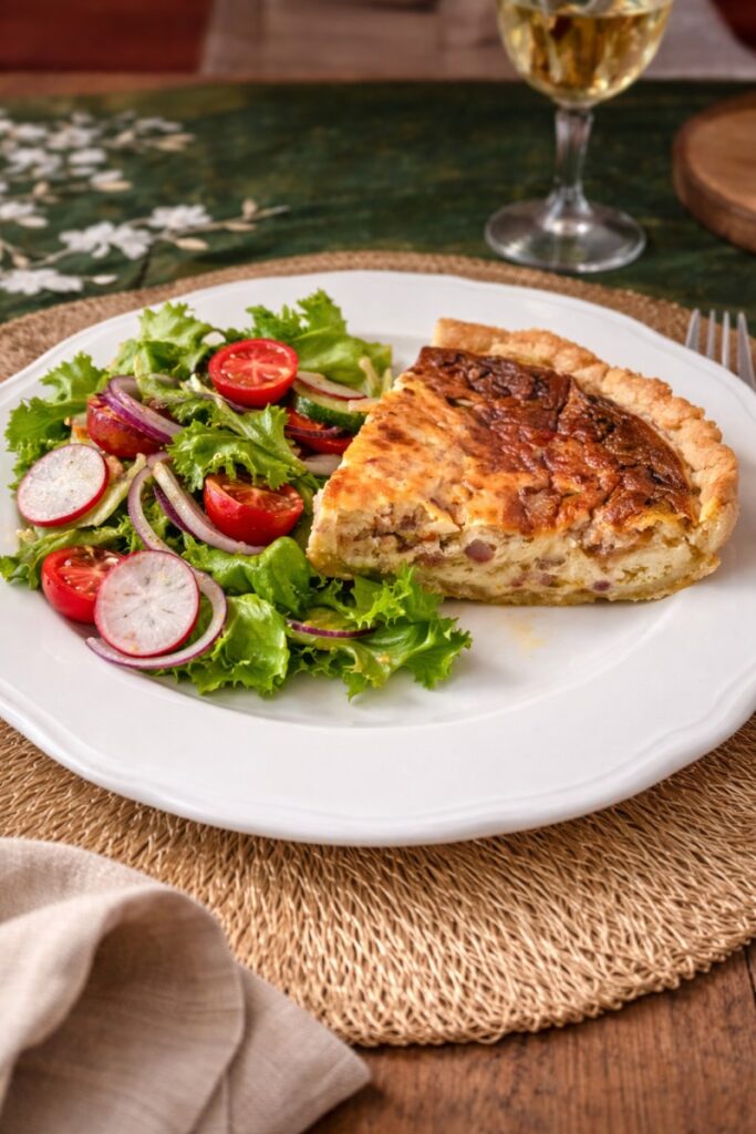 Quiche – rodzaj wytrawnej tarty na kruchym spodzie z masą na bazie jajek i śmietany. W tym przypadku głównymi składnikami są podsmażony boczek, podsmażona cykoria oraz ser Gruyère. Do tego proponuję podać chrupiącą sałatkę zieloną z miksu sałat, ogórka, rzodkiewki, cebuli czerwonej i pomidorków koktajlowych z musztardowo-miodową vinaigrette. Całość smakuje lekko i świeżo – idealny balans na elegancki, ale jednocześnie delikatny obiad.